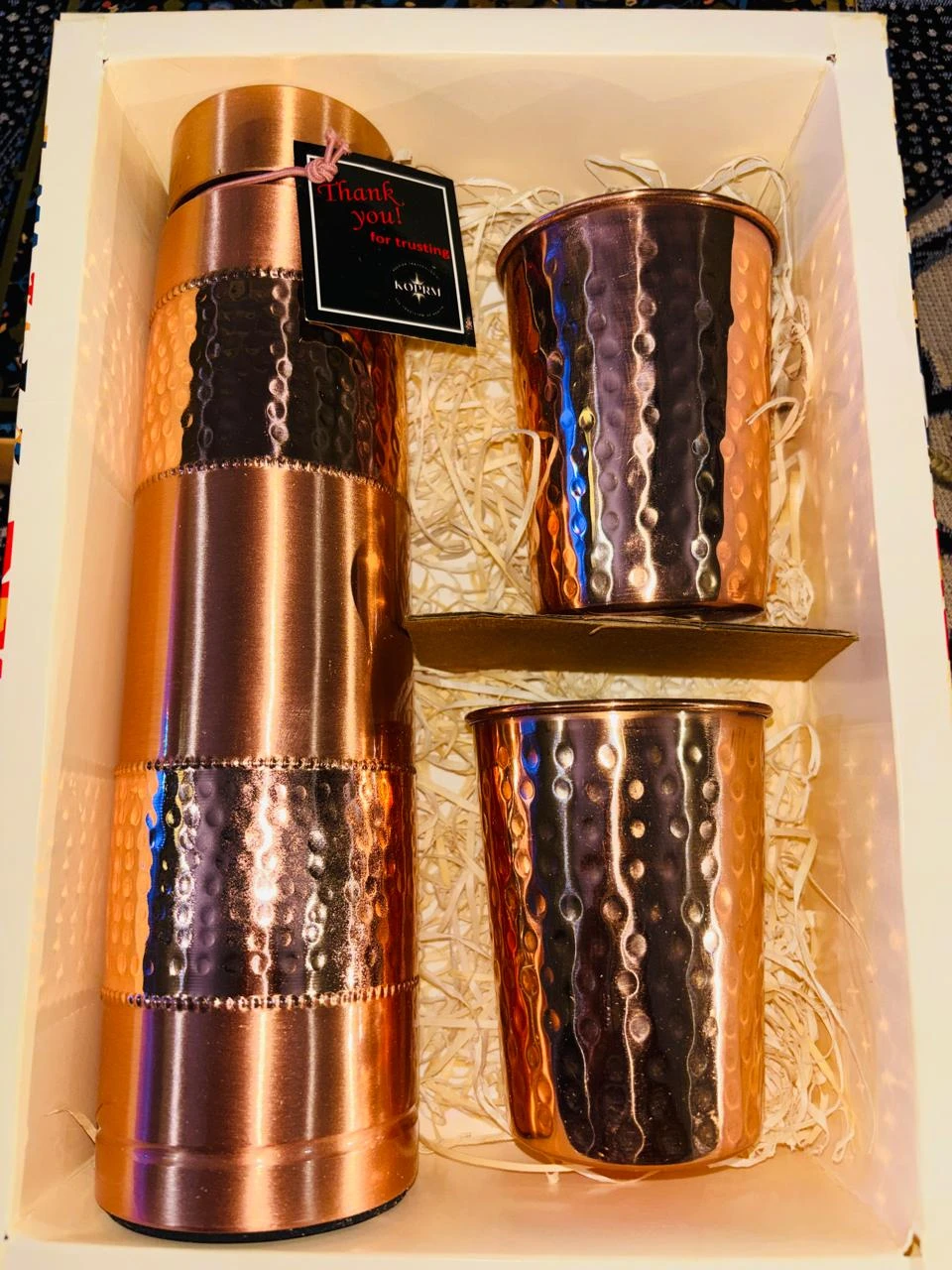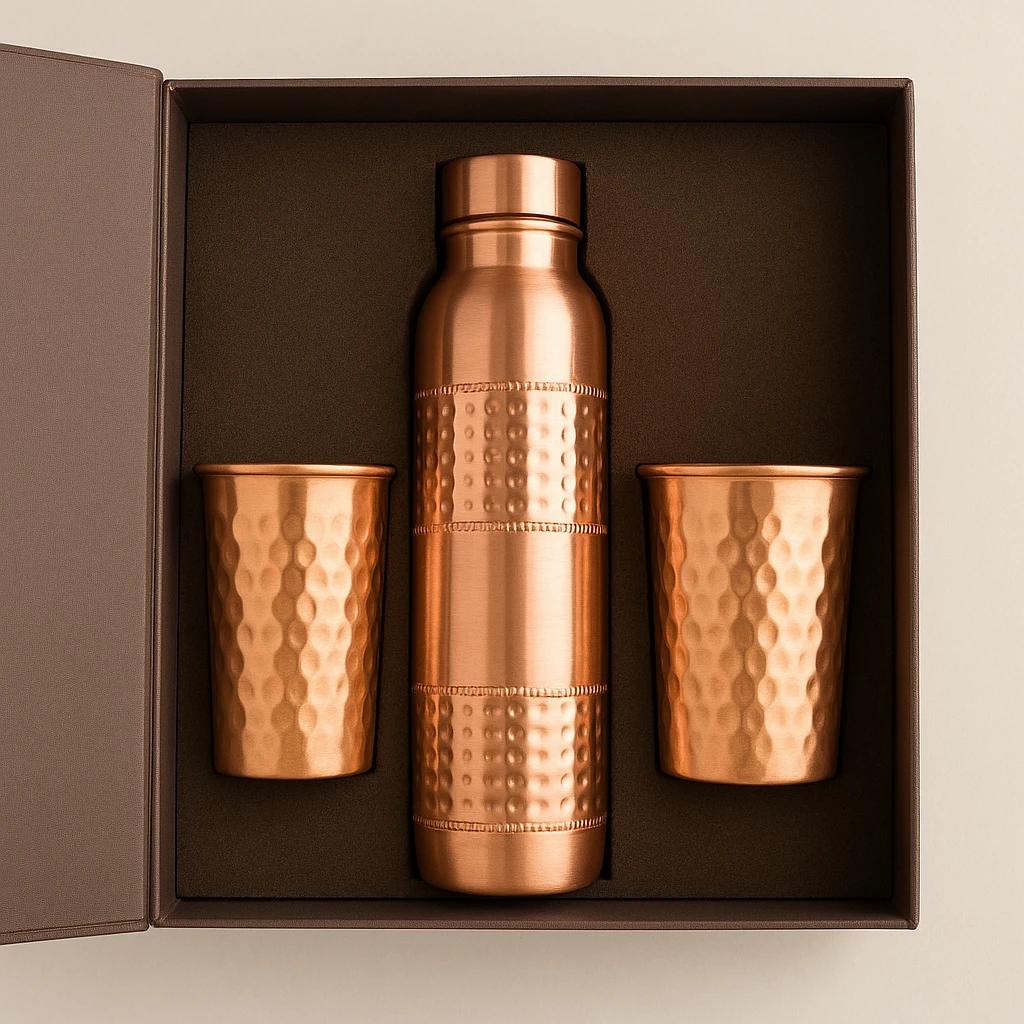 Elevate your gifting experience with this elegant hammered copper bottle gift set. Handcrafted to perfection, the set includes 1 premium hammered copper water bottle and 2 matching hammered copper glasses, beautifully packed in a luxury gift box.