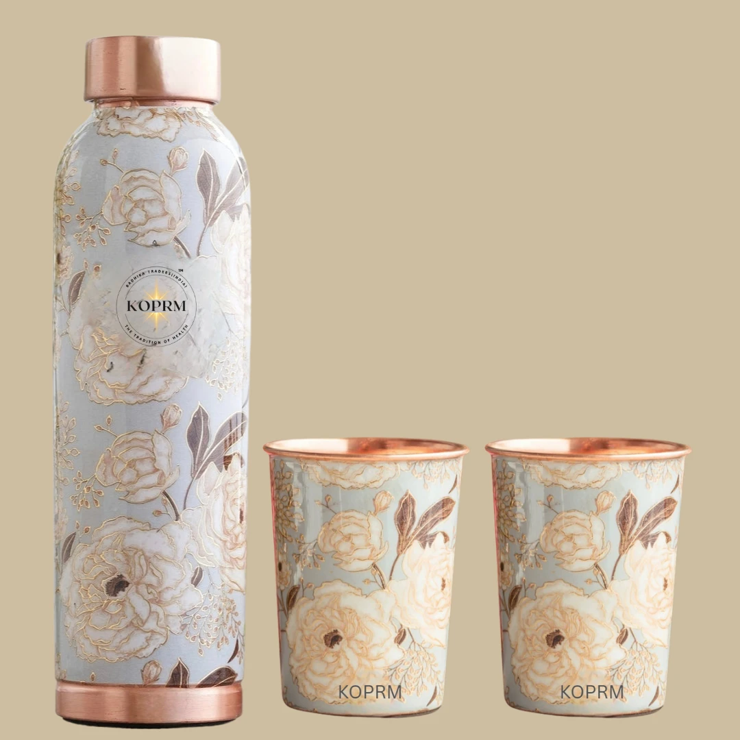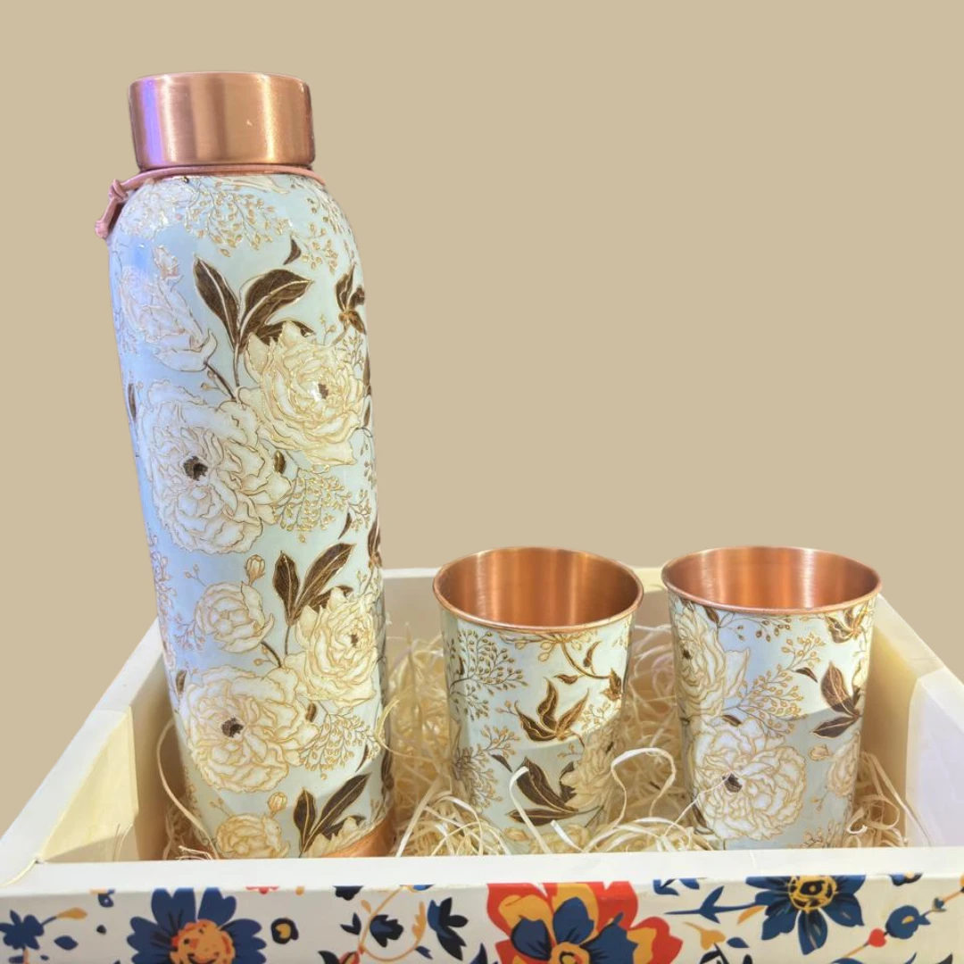 Celebrate the elegance of tradition and health with our 3D Meena Gift Set, featuring a beautifully crafted copper bottle and matching glasses adorned with exquisite 3D Meenakari designs.