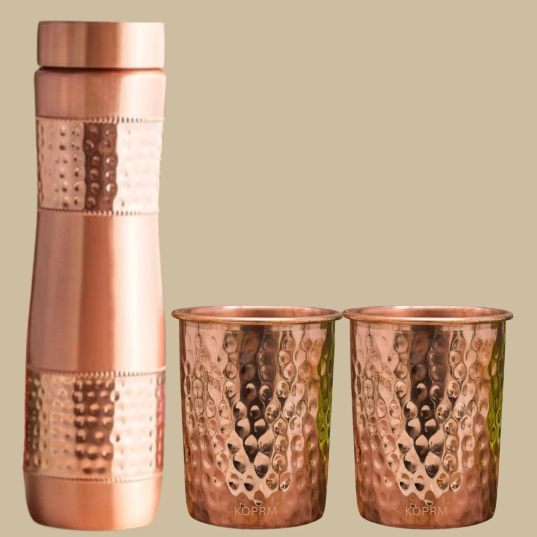 Elevate your gifting experience with this elegant hammered copper bottle gift set. Handcrafted to perfection, the set includes 1 premium hammered copper water bottle and 2 matching hammered copper glasses, beautifully packed in a luxury gift box.